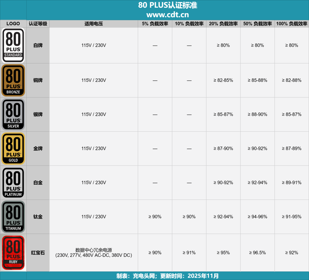 Ruby紅寶石認證是80PLUS 體系中面向數(shù)據(jù)中心的新高等級標準,于2025年提出,主要針對230V、277V、480V交流以及380V直流輸入的機架式冗余電源。在5%~100%全負載范圍內(nèi),它對效率和功率因數(shù)設(shè)定了明顯高于傳統(tǒng)白金、鈦金的門檻,例如在20%與50%負載點要求接近95%~96.5%的轉(zhuǎn)換效率,并在20%以上負載階段要求更高的功率因數(shù)。通過Ruby認證的電源,能夠在高密度機房場景中進一步壓縮能耗損失,為數(shù)據(jù)中心整體能效優(yōu)化提供更大的空間。
