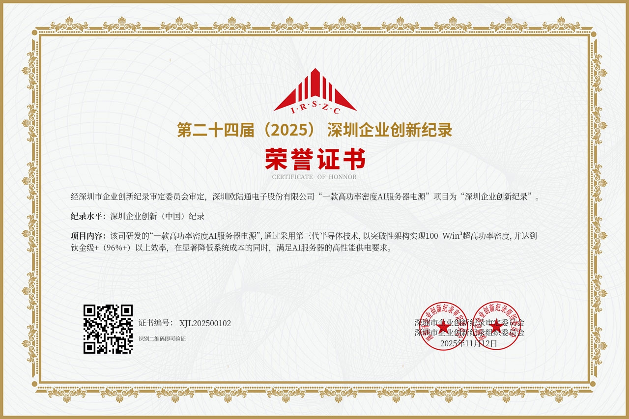 其中,歐陸通申報(bào)的“一款高功率密度AI服務(wù)器電源”、“一款大功率PoE網(wǎng)絡(luò)通訊電源”兩個(gè)項(xiàng)目被審定為“第二十四屆深圳企業(yè)創(chuàng)新(中國)紀(jì)錄”,并入選第二十四屆深圳企業(yè)創(chuàng)新紀(jì)錄“自主創(chuàng)新標(biāo)桿企業(yè)”。同時(shí),公司副董事長(zhǎng)王越天先生獲授“第二十四屆深圳創(chuàng)新紀(jì)錄——?jiǎng)?chuàng)新突出貢獻(xiàn)人物”。